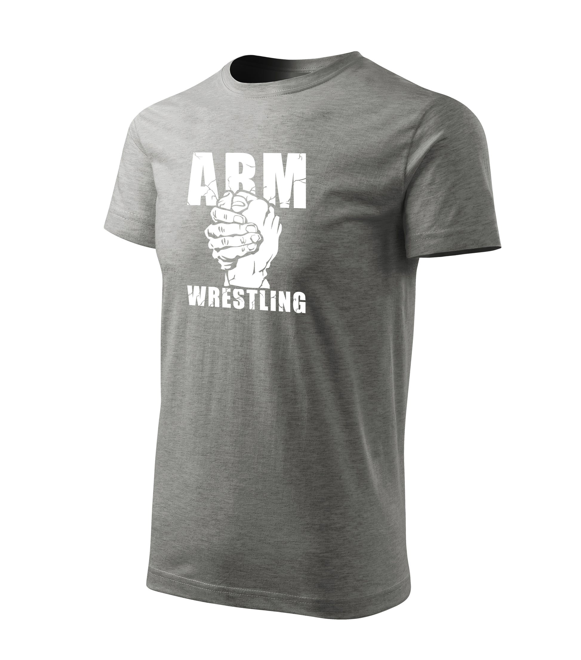 Fight-ready sport grey tee with a clean white chest print that stays sharp in any setting - gym, club meet, or tournament day. The front features a bold stacked design: cracked ARM block lettering on top, a classic clasped-hands armwrestling emblem in the center, and WRESTLING stamped underneath for a strong, no-nonsense finish. Plain back keeps it minimal and easy to style with anything.