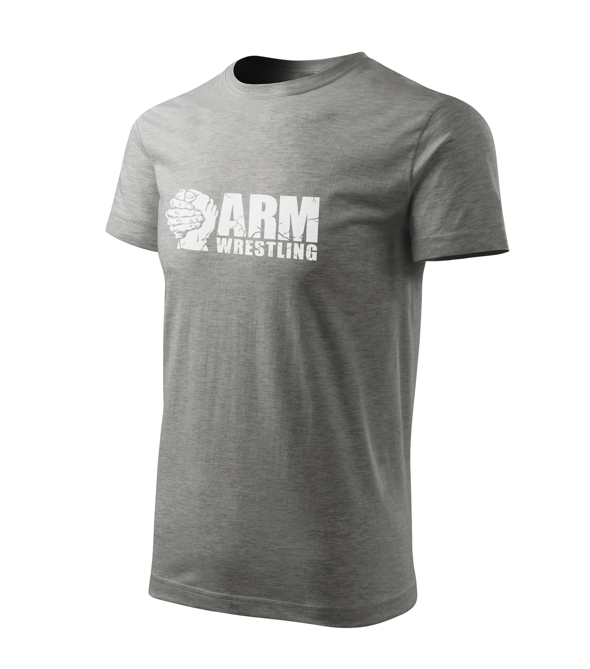 Clean, fight-ready heather grey tee with a bold white chest print. Across the front runs a wide block logo with clasped armwrestling hands on the left and cracked ARM WRESTLING lettering that looks like it’s been cut straight out of the table. The subtle melange texture of the fabric gives it a more casual, street-ready vibe, while the back stays plain so the graphic stands out and works with any gear.