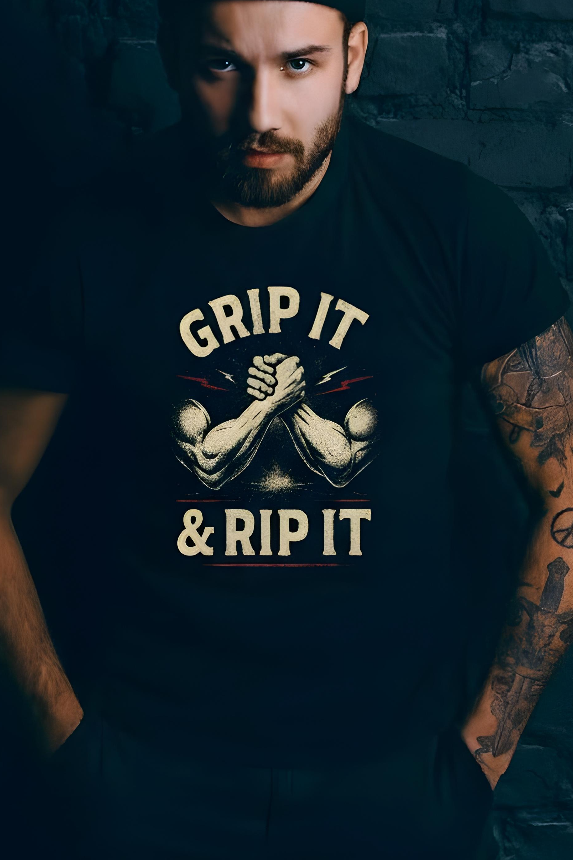 Statement cotton tee with a vintage fight vibe. Deep black base and a bold front graphic: clasped arms at center with the slogan GRIP IT & RIP IT in aged cream, subtle red accents, and a lightly distressed finish. Athletic cut that frames the shoulders and chest. Clean back with no graphics. Ribbed crew neck and reinforced seams for everyday durability.