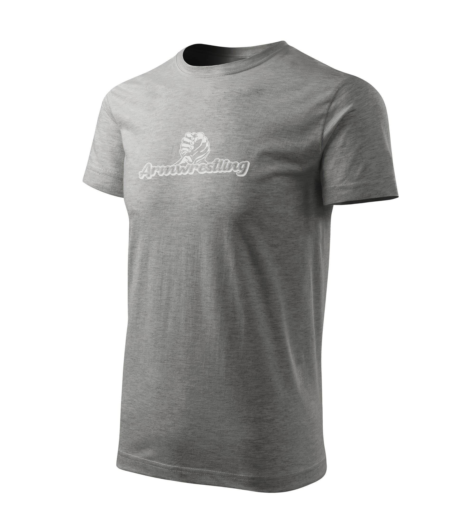 Heather-grey cotton tee with a clean chest graphic: clasped-hands emblem above a bold Armwrestling script in a subtle contrasting outline. Plain back. Athletic cut that frames the shoulders and chest. Ribbed crew neck and reinforced seams for everyday durability and comfort.