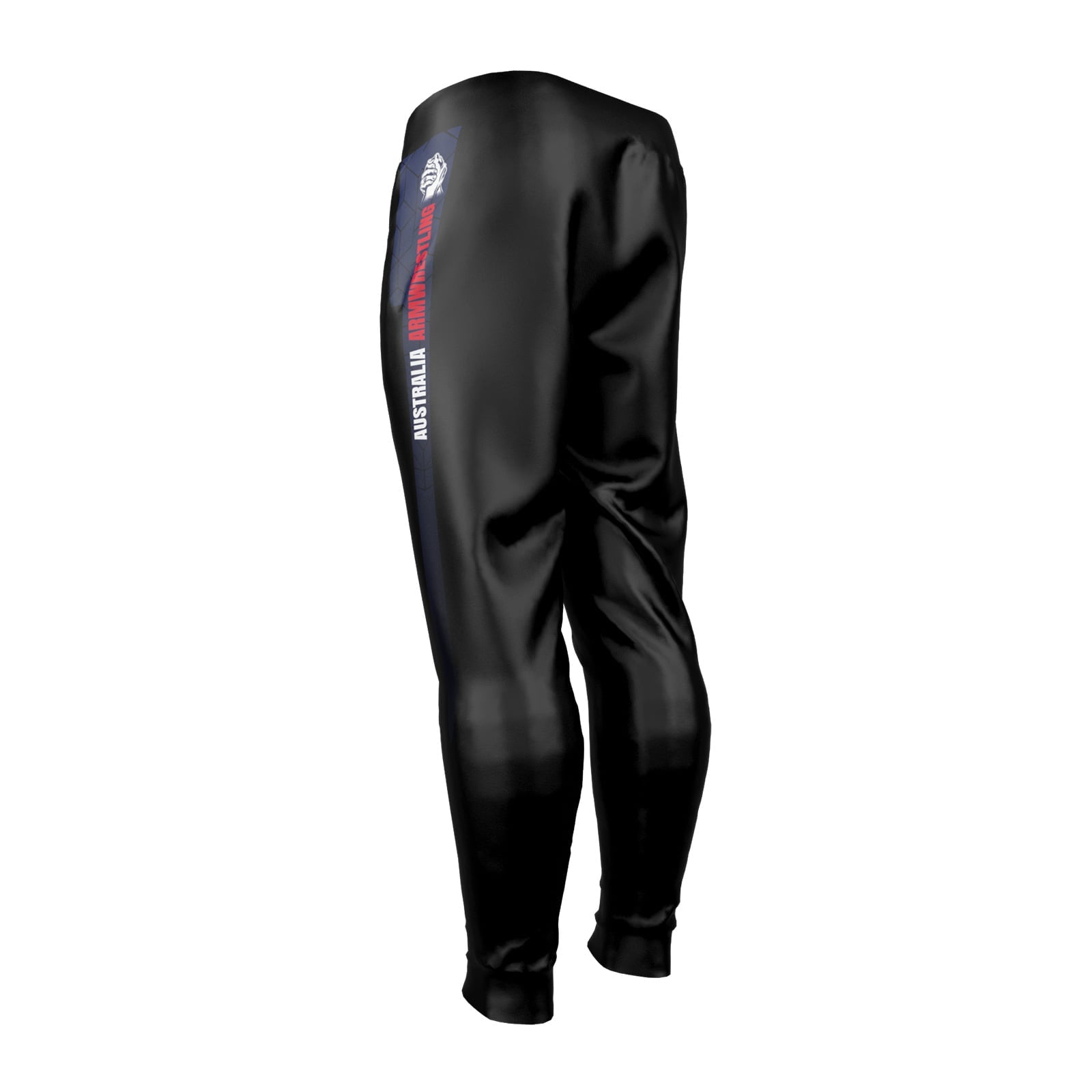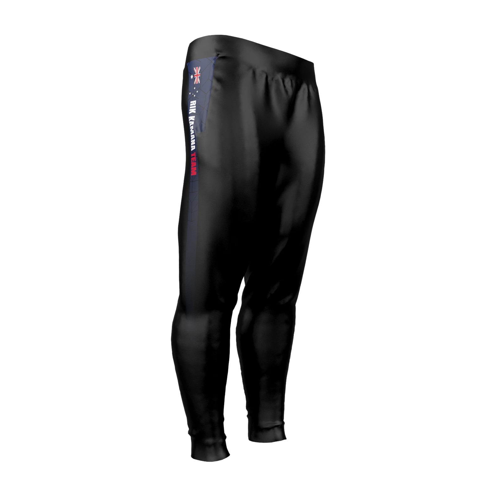 Train and travel in Team Australia style. Tapered performance joggers made from smooth, quick-dry polyester with light stretch for full mobility. Deep black base with navy side panels and a vertical TEAM AUSTRALIA / RIK KAMANA wordmark stripe.